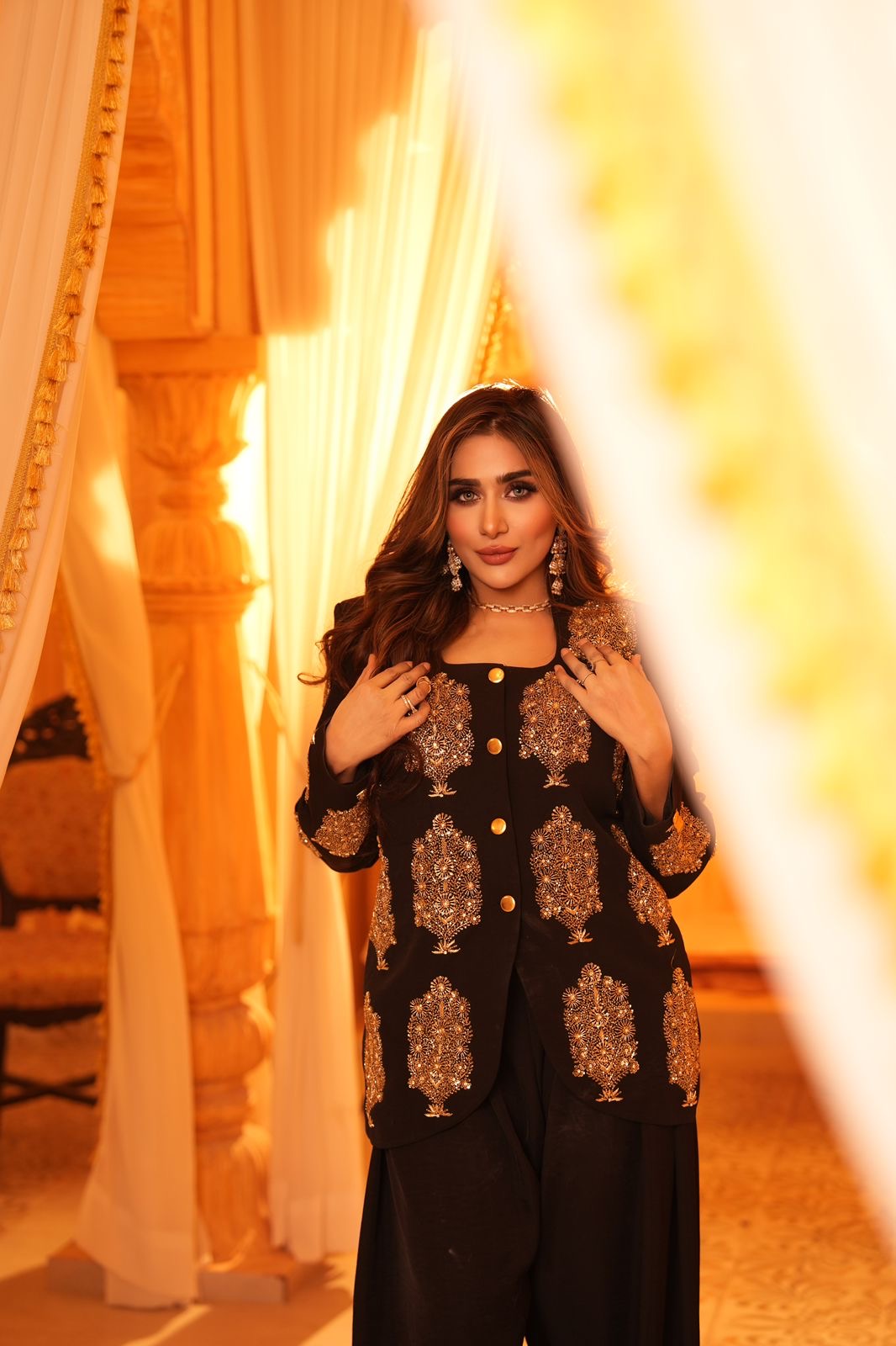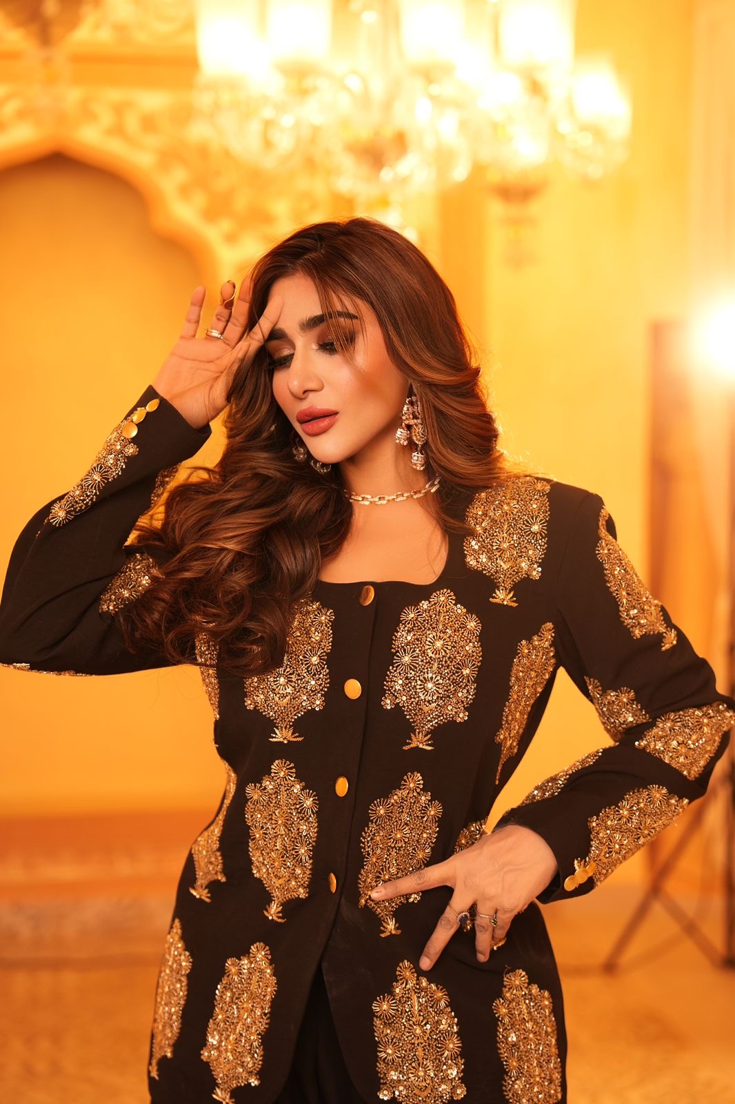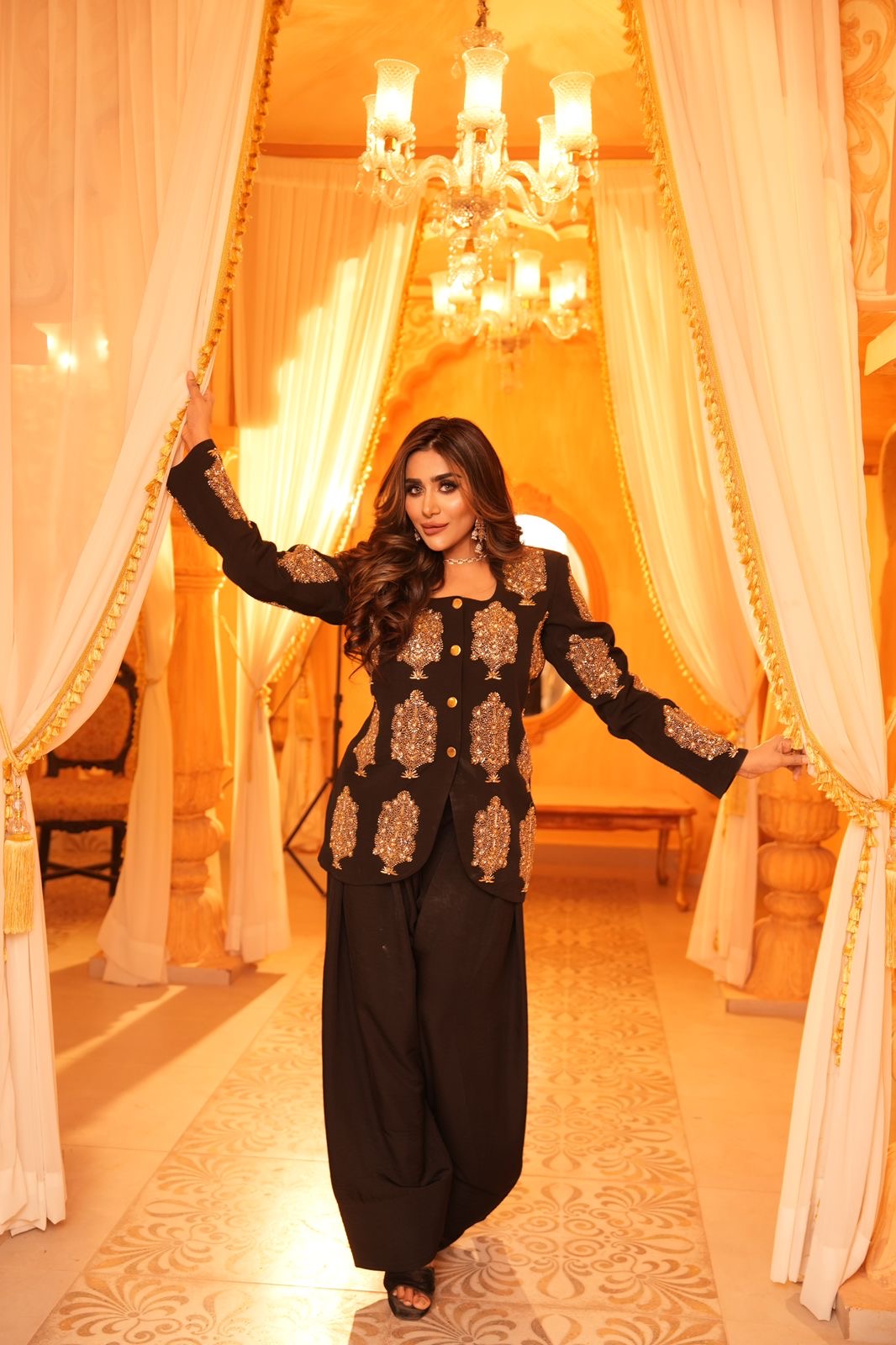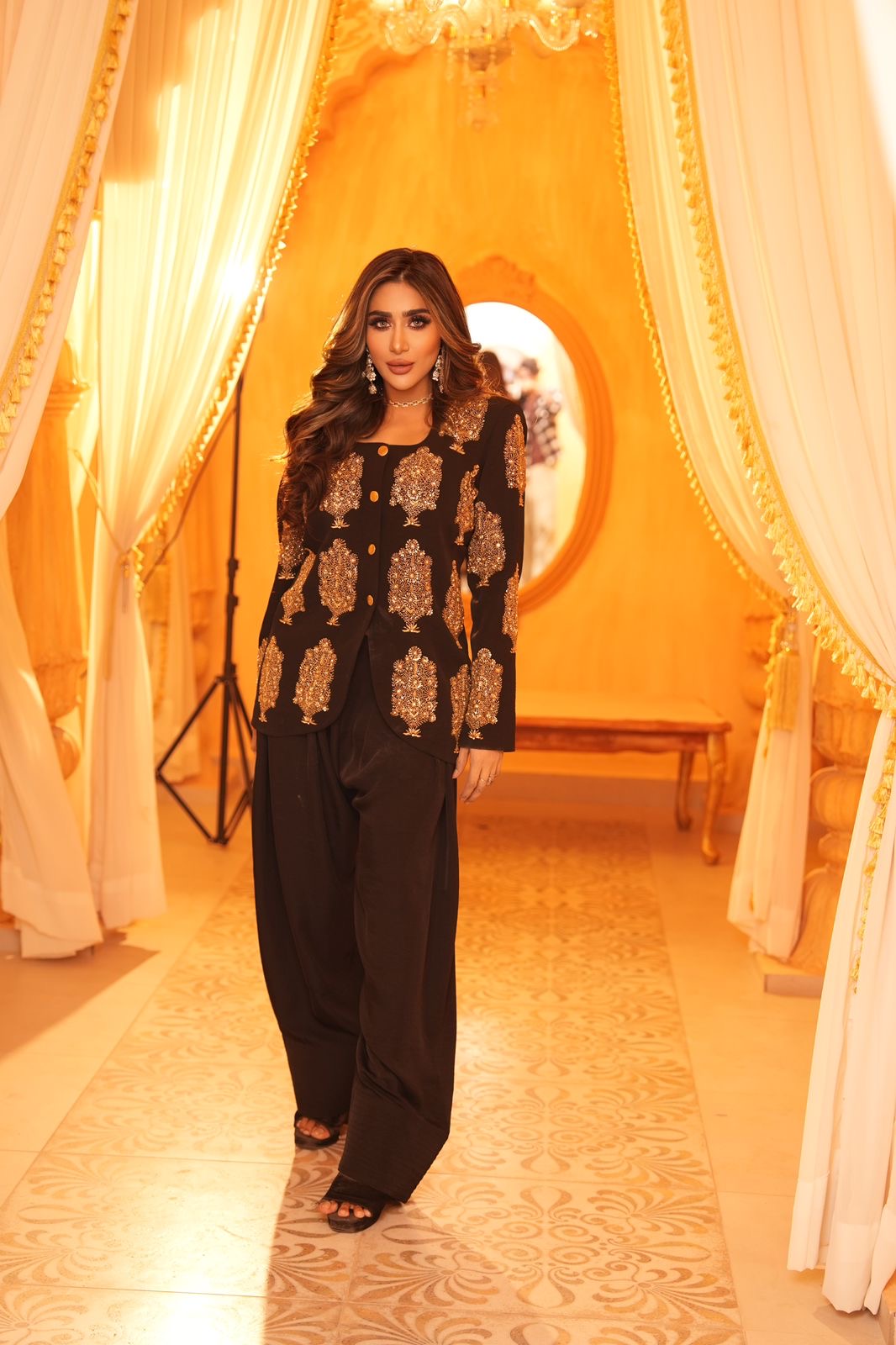 A sophisticated black ensemble adorned with intricate gold embroidery, “Midnight Royale” embodies timeless elegance and regal charm. The tailored long jacket features ornate gold motifs and statement buttons, creating a structured yet graceful silhouette. Paired with flowing wide-leg trousers, the look balances power with poise. Set against a grand, chandelier-lit backdrop, this outfit radiates luxury, confidence, and modern royalty — perfect for formal evenings and statement occasions. ✨