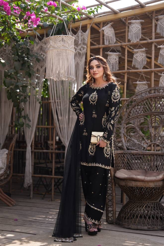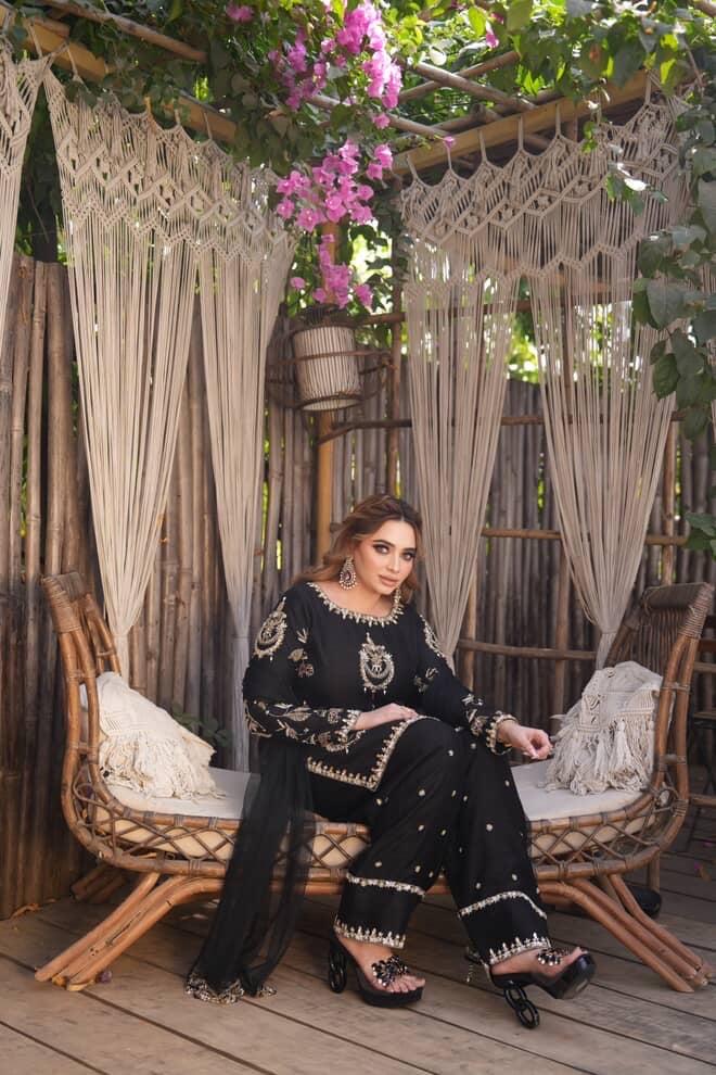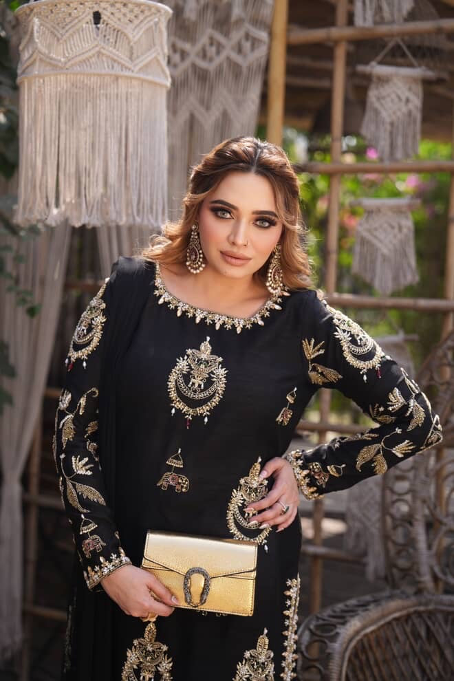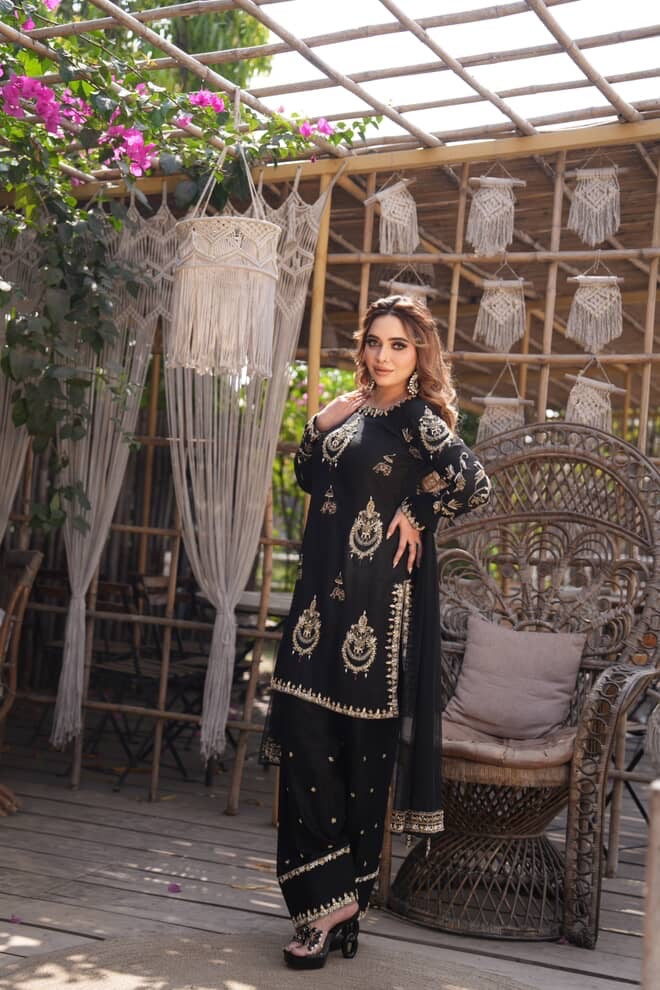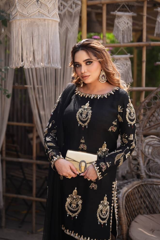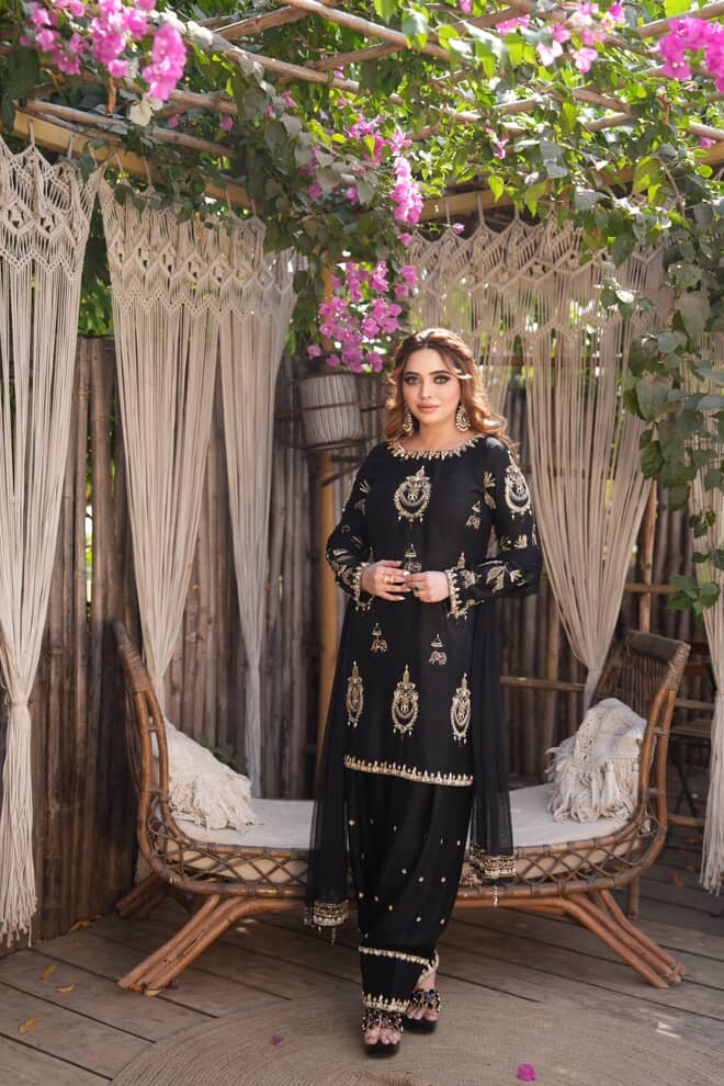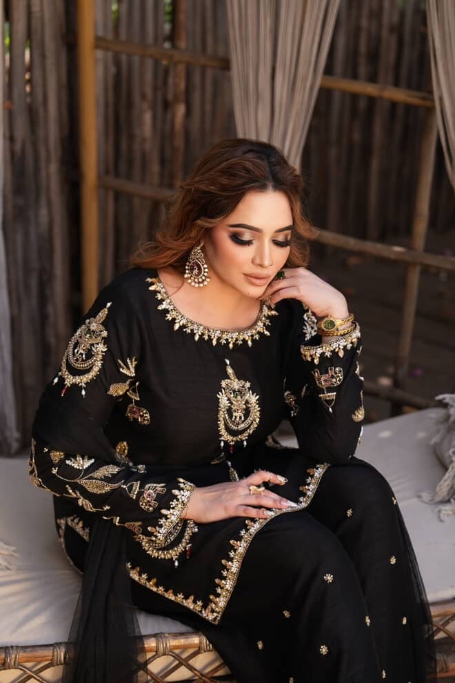 Exuding timeless sophistication, this striking black ensemble is a celebration of elegance and detail. The beautifully tailored kurta is adorned with intricate gold motifs that shimmer gracefully against the deep midnight hue, creating a regal contrast. Paired with coordinated trousers featuring delicate embellishments and a sheer flowing dupatta, the look is both powerful and poised.